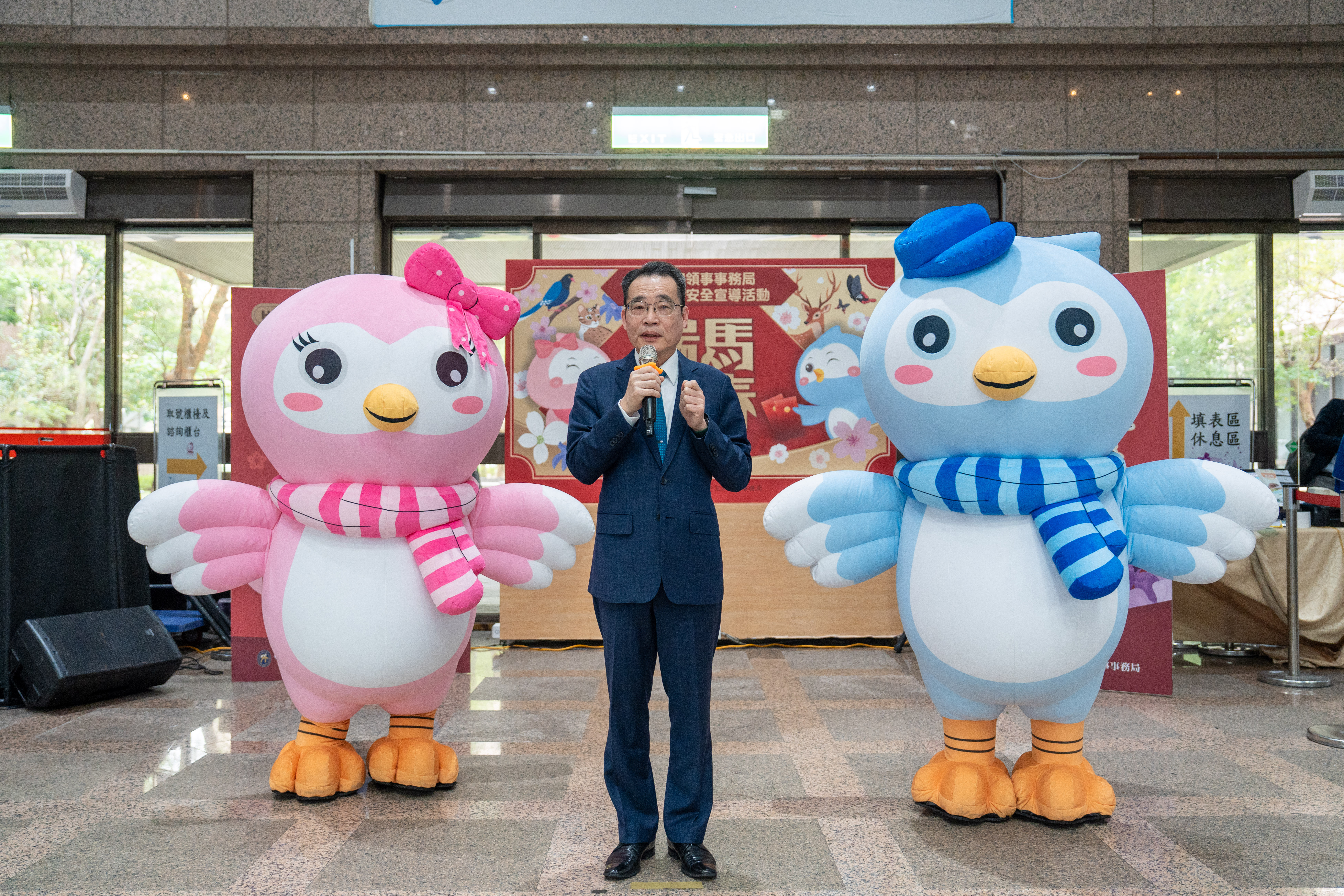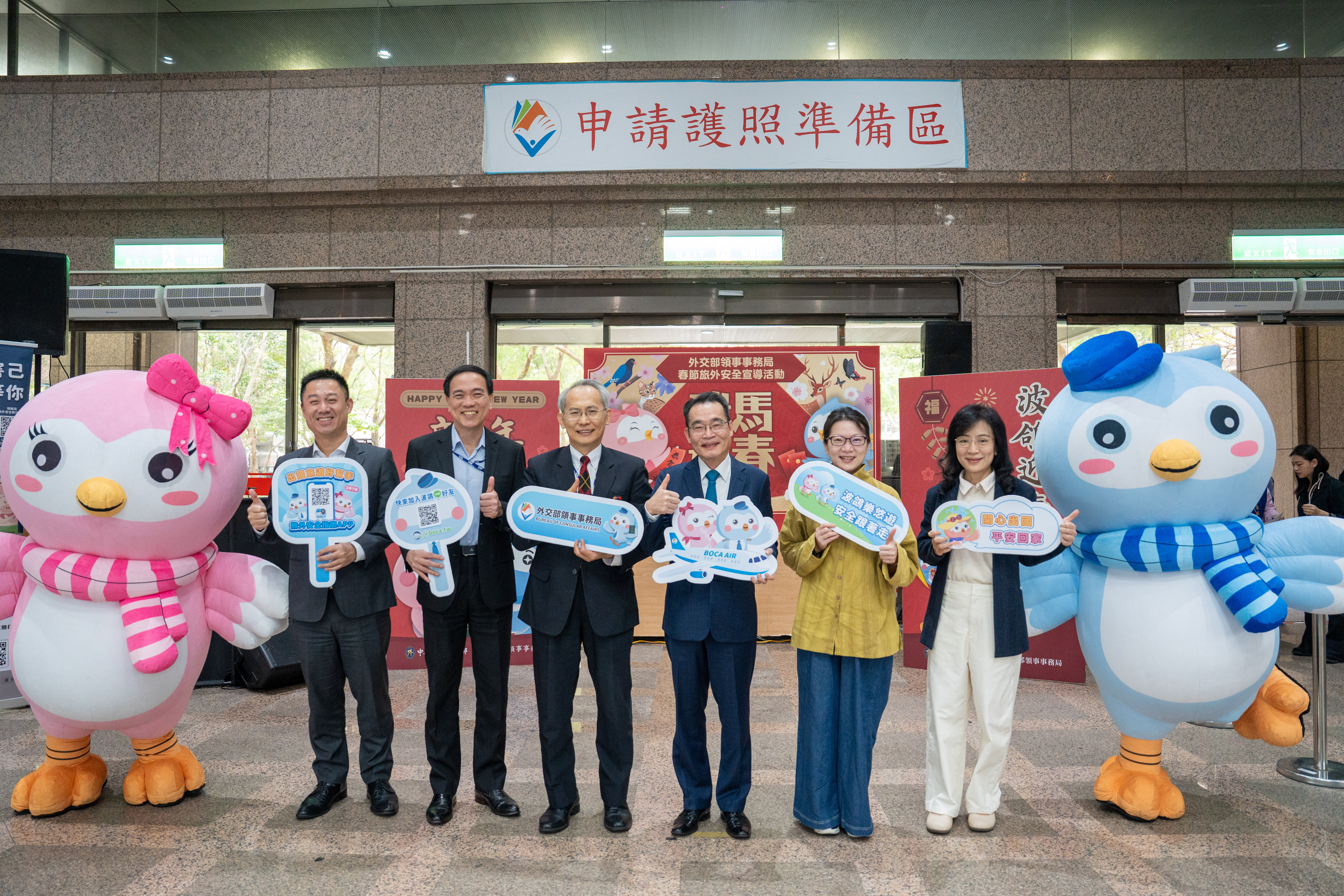 外交部領事事務局今(2026)年2月6日上午在領務局一樓大廳舉辦「瑞馬迎春,波鴿賀歲送紅包禮」農曆春節旅外安全宣導活動。
