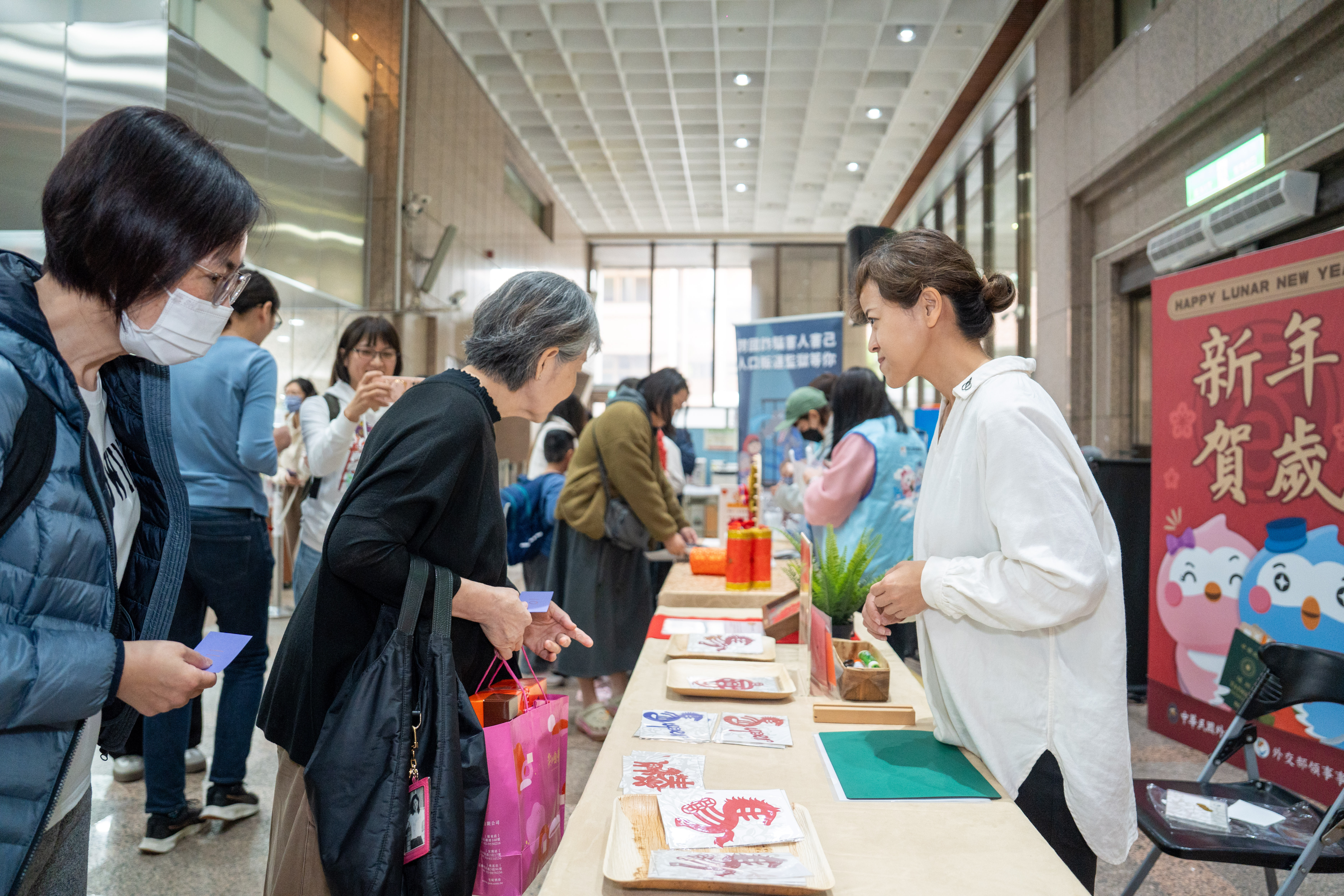 另為增添活動年節氣氛,領務局也邀請剪紙藝術家及專業氣球達人在現場手工製作馬年造型窗花及氣球送給民眾;另也擺設好運戳戳樂及祝福轉盤等遊戲,鼓勵民眾加入該局LINE帳號好友及下載「旅外安全指南」APP,即可兌換精美波鴿文宣品,現場民眾反應熱烈,年節氣氛濃厚。另當天及2月9日至10日上班時間,民眾憑繳費收據即可領取限量「波鴿迎春紅包禮盒組」,參與情形踴躍。(E)
