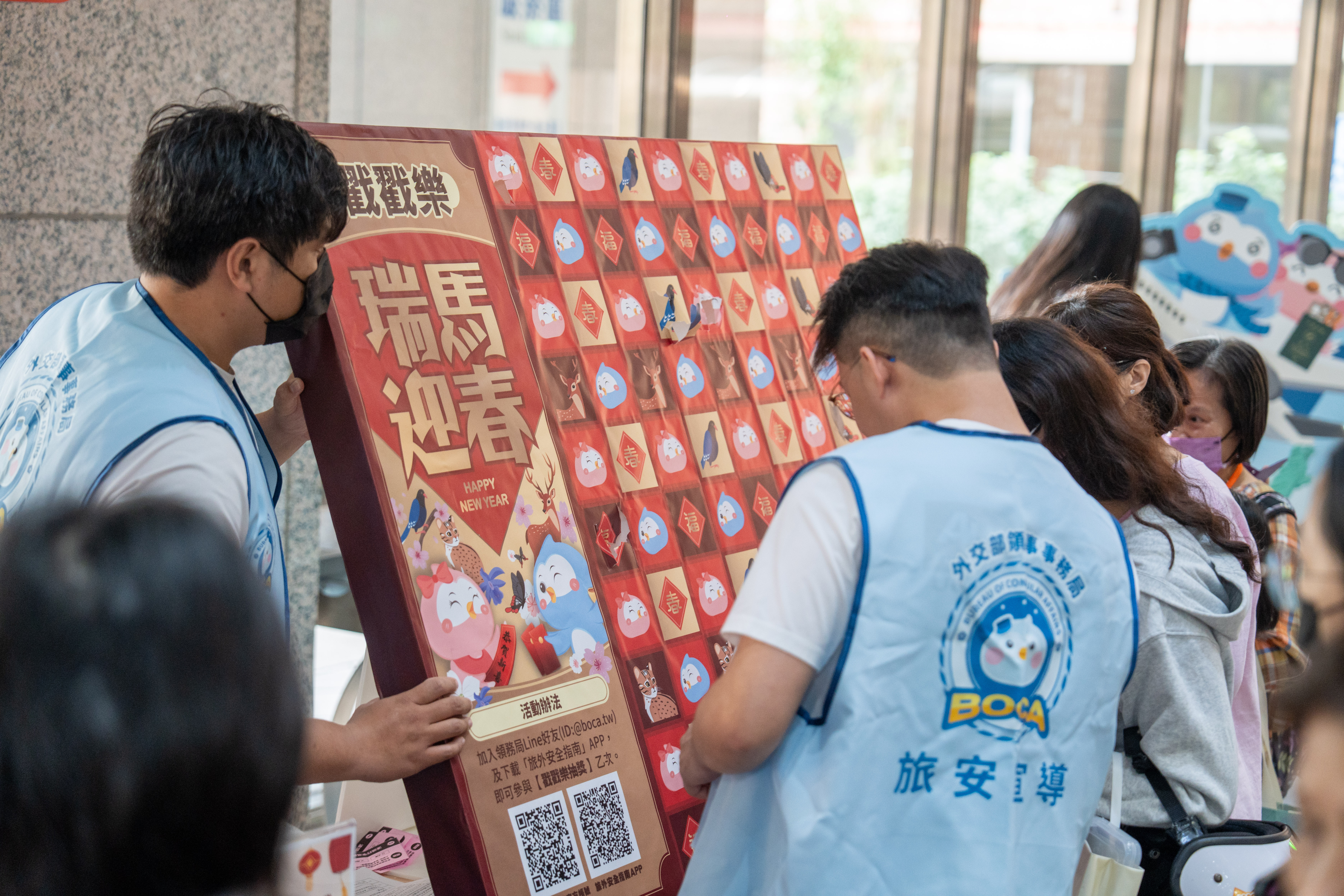 馬年春節假期即將到來,領務局特別於2月6日上午在領務局一樓大廳向前來洽辦領務的民眾宣導旅外安全注意事項,及介紹外交部旅外國人急難救助服務。現場安排領務局吉祥物波鴿及波妹與民眾互動,並邀請莊敬高職JJ Twice 舞團以熱情又活潑的表演,帶動現場氣氛。隨後舉辦旅外安全互動有獎徵答,藉此宣導旅外安全相關的出國行前準備注意事項、急難救助專線、出國登錄等資訊,另也針對防制海外求職詐騙及購買海外旅遊保險等重要性議題加強宣導。