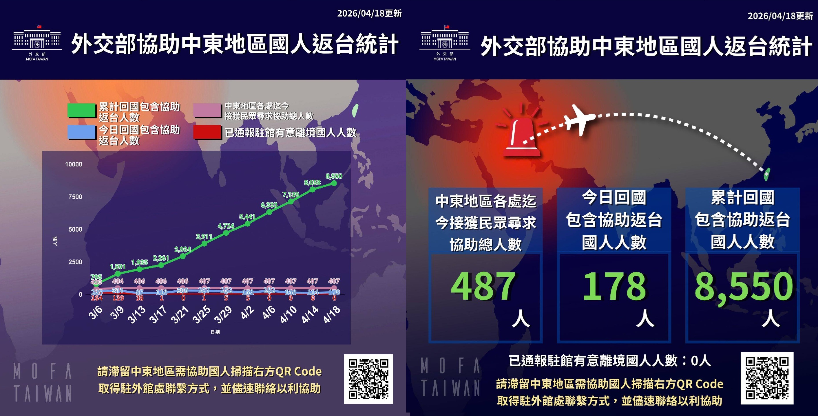 外交部再次呼籲國人審慎評估近期前往相關高風險國家商旅或轉機之必要性,如仍有前往需求,務請提高警覺,並請於出發前登錄「旅外國人動態網頁」,以利我國駐外館處即時聯繫並提供必要協助。