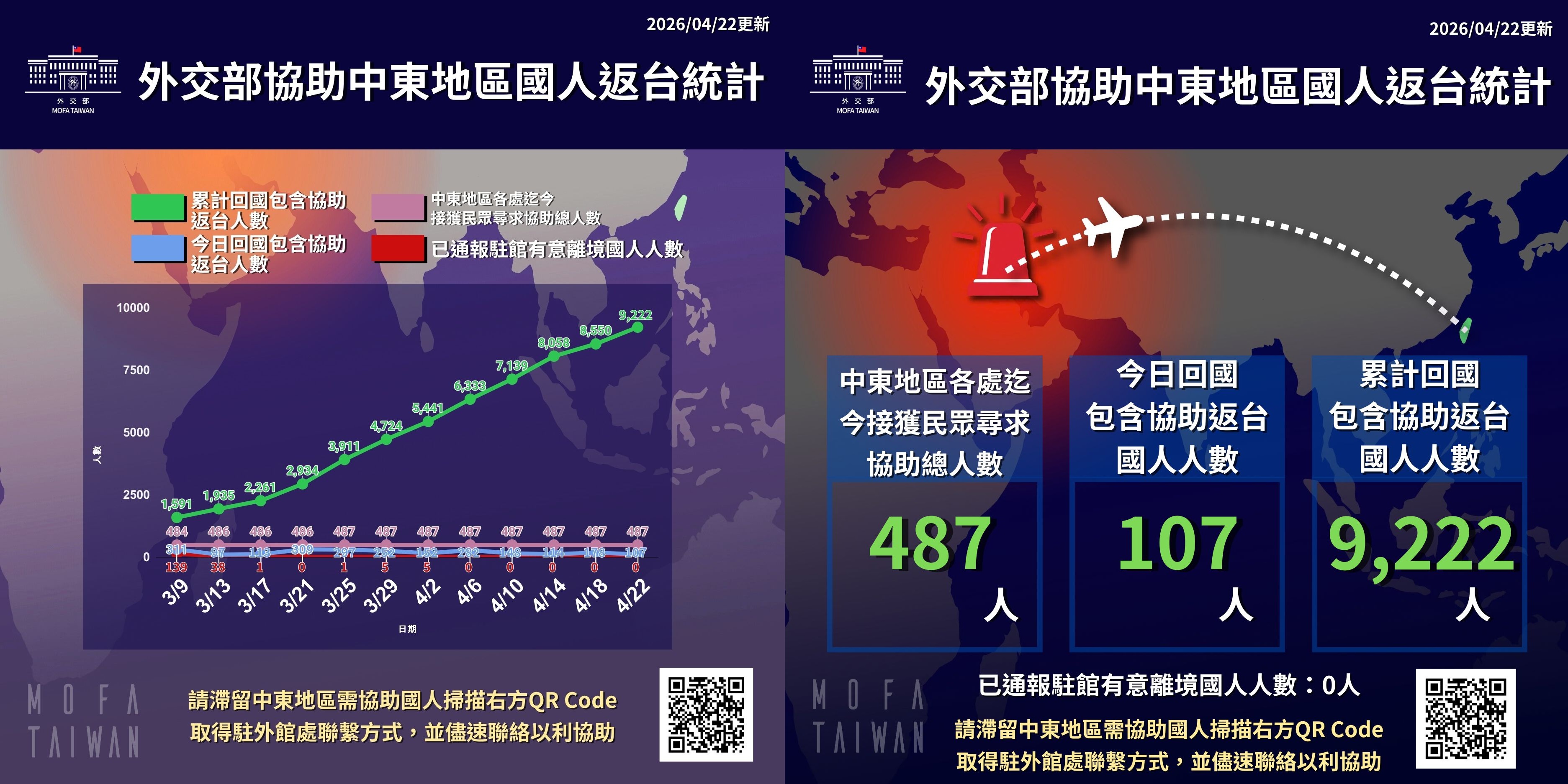 外交部再次呼籲國人審慎評估近期前往相關高風險國家商旅或轉機之必要性,如仍有前往需求,務請提高警覺,並請於出發前登錄「旅外國人動態登錄系統」,以利駐外館處即時掌握國人動態並提供必要協助。